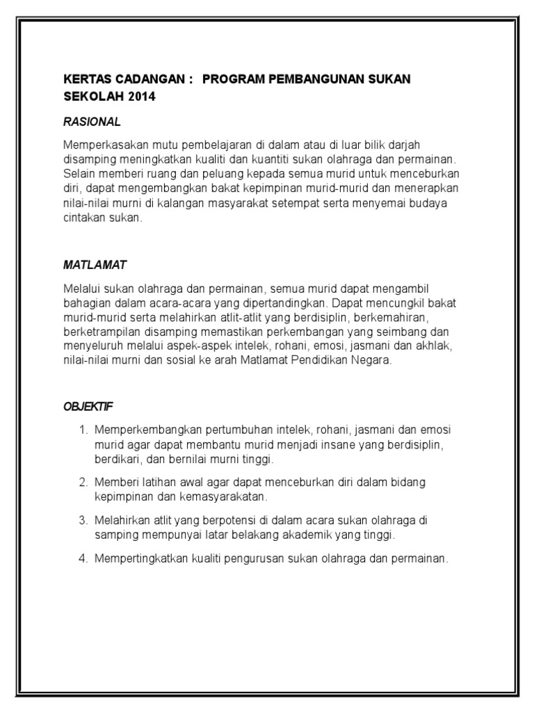 Kertas Kerja Program Pembangunan Sukan Sepaktakraw. Contoh Kertas Kerja Sukan. 5 27 2017 0 comments 1 0 nama program program merentas desa sempena hari sukan negara peringkat sekolah 2017.