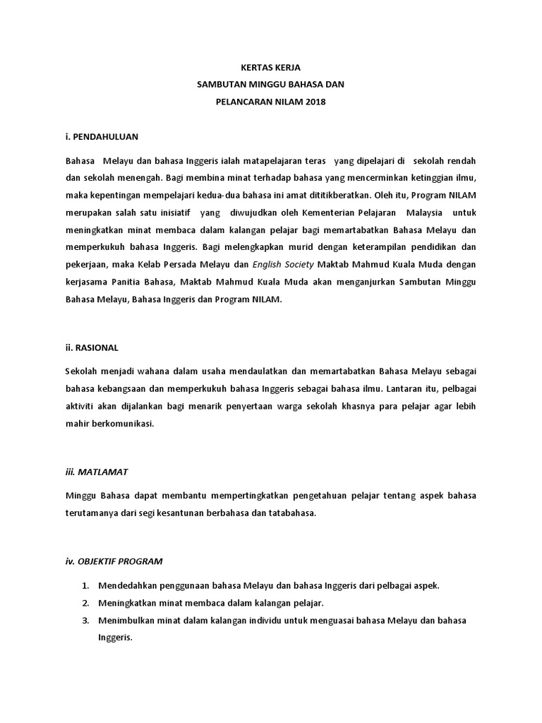 CADANGAN PENAMBAHBAIKAN Pada tahun 2012 dicadangkan agar Program Minggu Bahasa Melayu ini dapat dijalankan pada awal tahun bagi memantapkan lagi pelaksanaannya. Kertas kerja program bulan bahasa. KERTAS KERJA UNTUK PROGRAM MINGGU BAHASA MELAYU 2011 10 PENDAHULUAN Selaras dengan Dasar Pendidikan Kebangsaan yang termaktub dalam Akta Pendidikan 1996 Bahasa Melayu ialah mata pelajaran teras di semua sekolah rendah dan menengah.