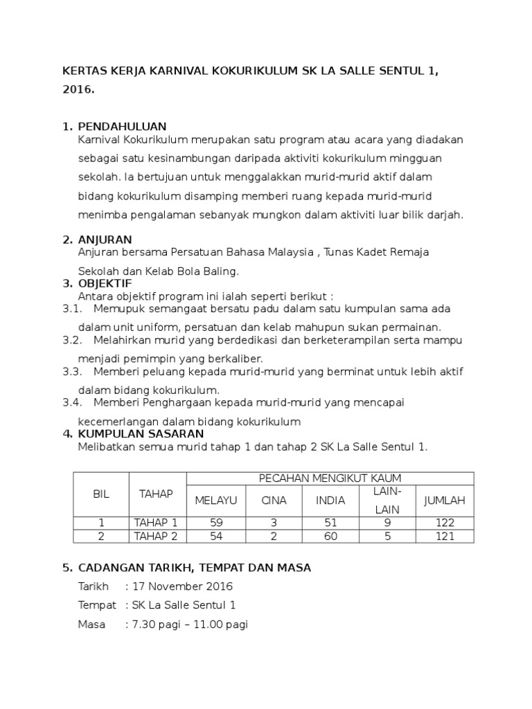 24 Julai 2010 12 Syaaban 1431. Contoh Kertas Kerja Hari Karnival Kelab Dan Persatuan Akademik. KERTAS KERJA KARNIVAL KOKURIKULUM SK LA SALLE SENTUL 1 2016.